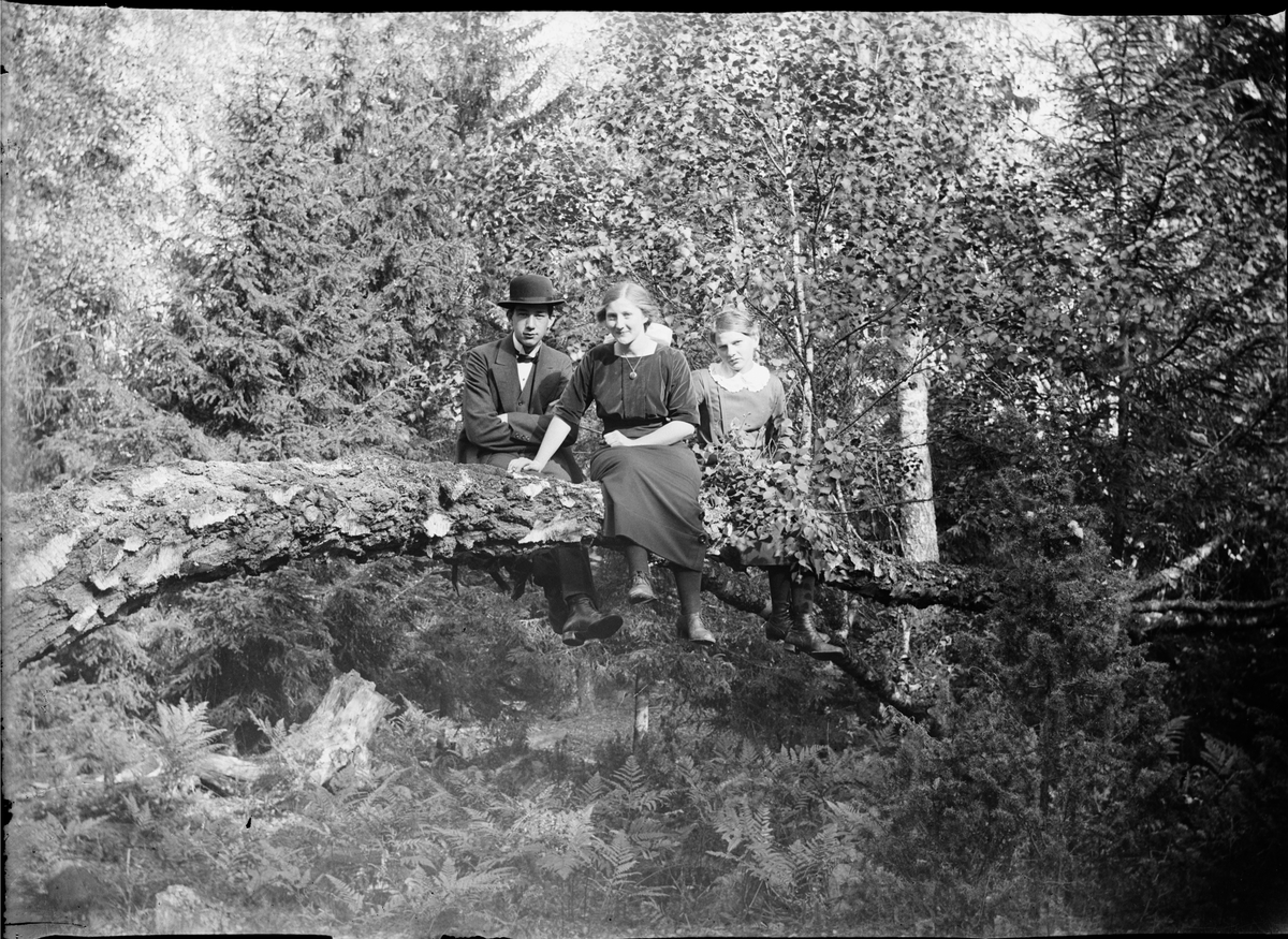 Josef, Sara och Irma sitter på en trädstam i skogen, Östhammar, Uppland