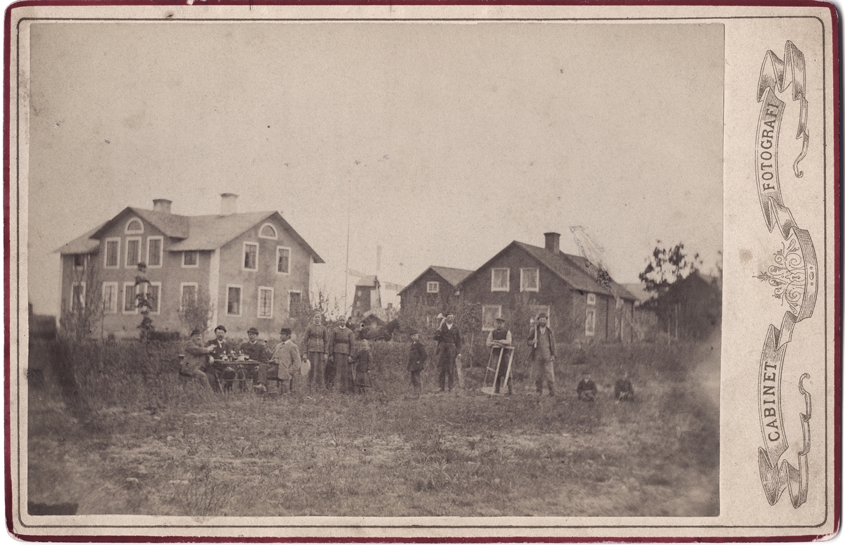 Kabinettsfotografi - kvinnor, män och barn samlade framför gård, sannolikt Tierp, Uppland