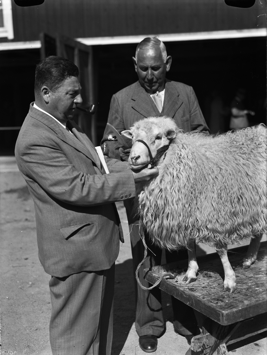 "Rekordpriser på fåravelsföreningens auktion" - husdjurskonsulent S Lindén och förvaltare Carlsson synar en bagge, Ultuna, Uppsala september 1942
