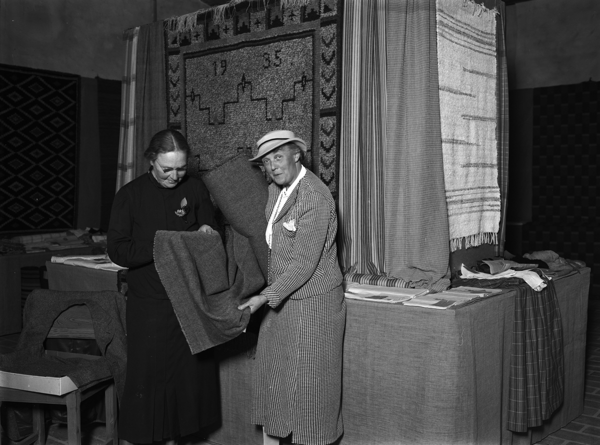 Vice ordförande Gertrud Wiklund och ordförande Fanny Nilsson granskar ett kostymtyg från Rasbo i Uppsala läns husmodersförbunds hemslöjdsutställning på Uppsala slott