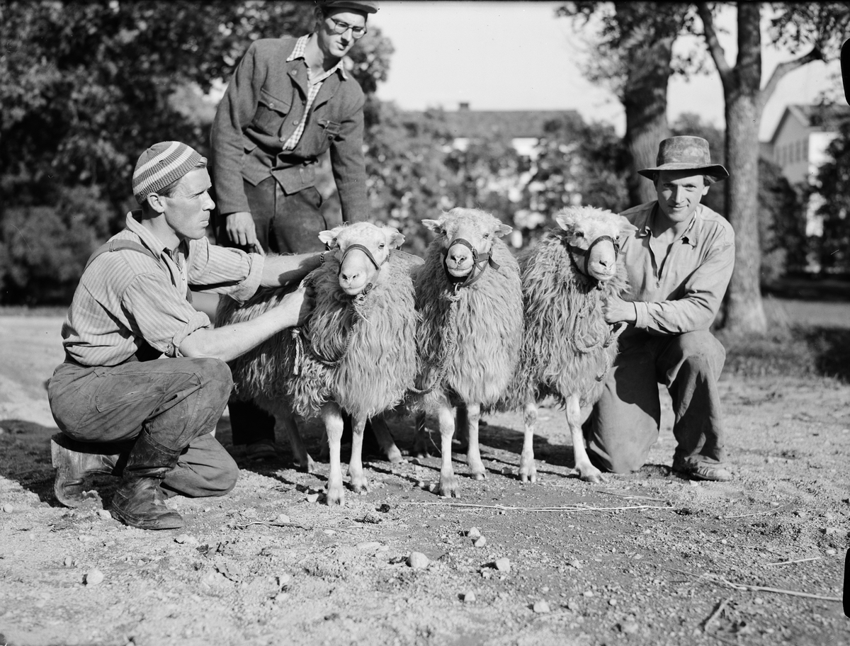 Bernt Håkansson och Bo Holmquist med avelsbaggarna Sik, Mats och Levi, Ultuna, Uppsala 1948