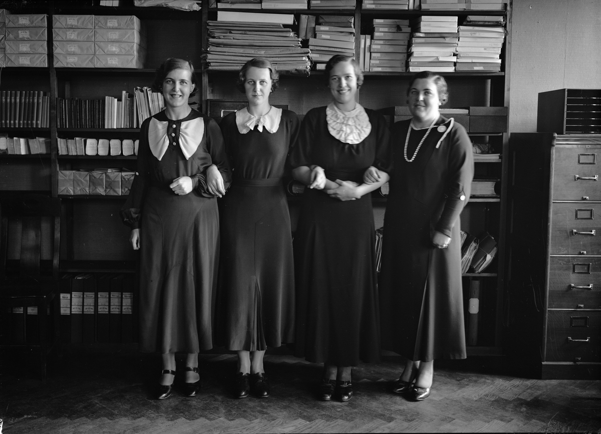 Grupporträtt - personal hos hundrarårsjubilerande AB Lundequistska Bokhandeln, Drottninggatan - Östra Ågatan