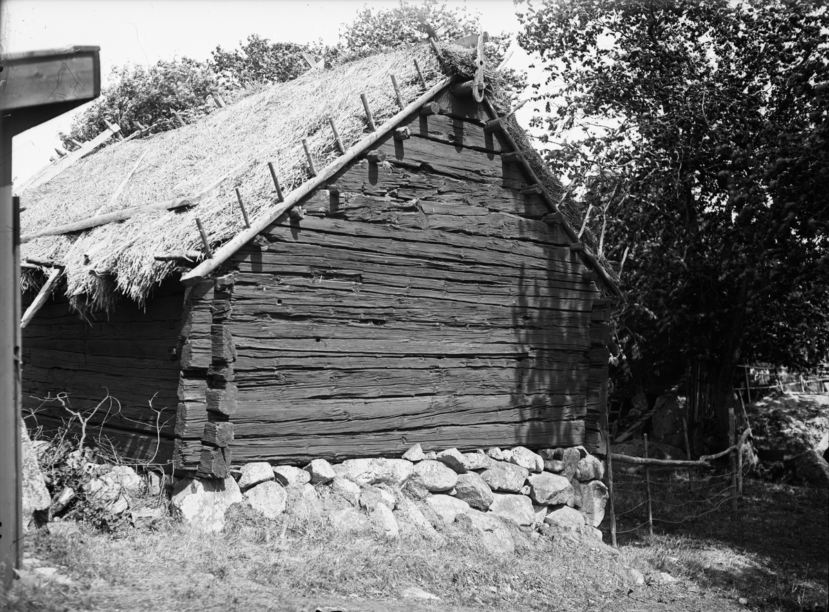 Halmtak på källarbod, Oppgården, Berga, Danmarks socken, Uppland, sannolikt 1920-tal