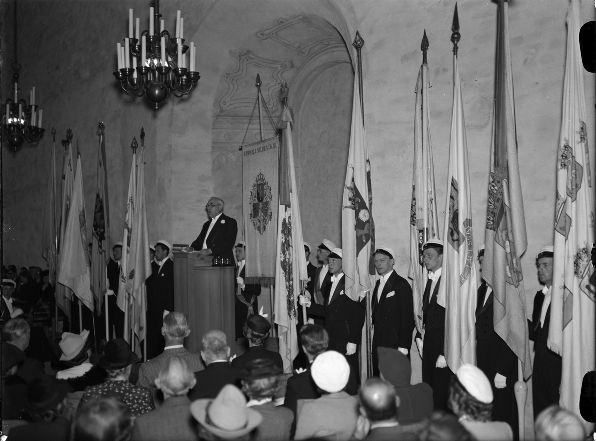 Professor Nils Ahnlund högtidstalar på Uppsala Studentkårs vårfest i Rikssalen, Uppsala slott