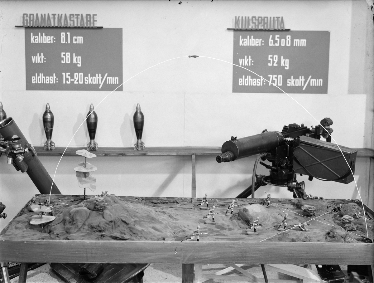Modell och vapen i Upplands Regementes "Landsbygdens försvarsutställning" i utställningslokalen på Svartbäcksgatan 25