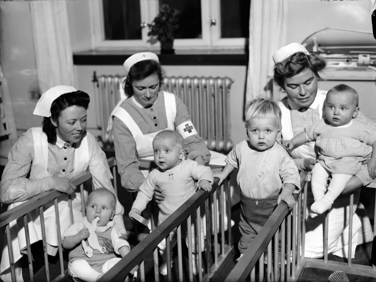 Sjukvårdspersonal med barn på avdelningen för finska flyktingbarn på Akademiska sjukhuset