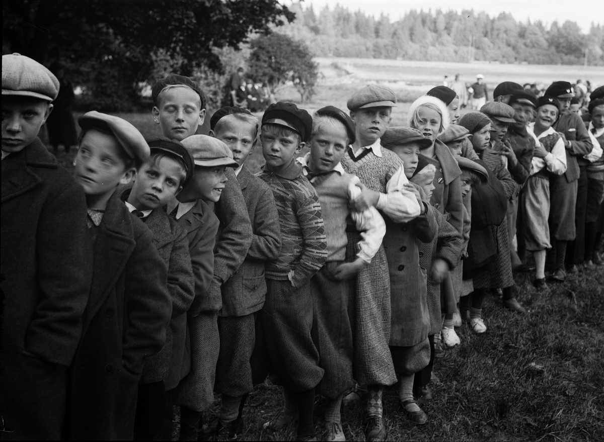 Titel: Köande barn som väntar på att få varm choklad och bullar på "Barnens ö" vid Liljekonvaljeholmen under Barnens Dags-firandet