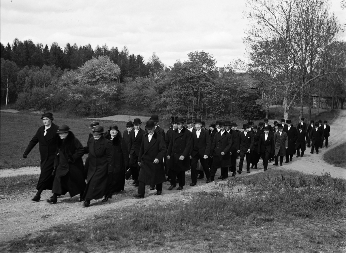 "Bruksfolket ansluter sig till processionen vid passerande av Vattholma bruk" - vid friherre Fredrik von Essens jordfästning i Lena kyrka