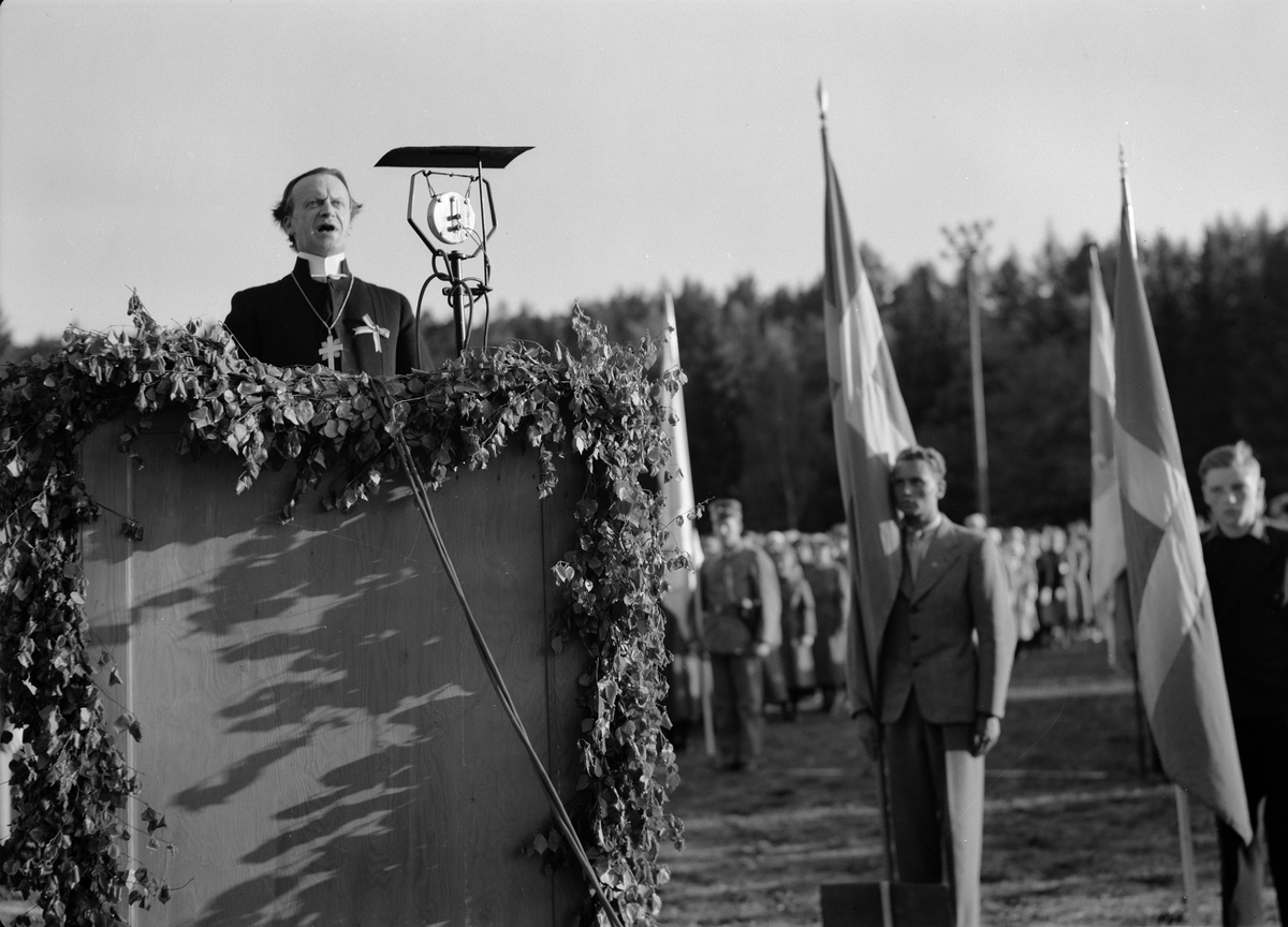 Ärkebiskop Erling Eidem talar, nationaldagsfirande på Studenternas Idrottsplats, Uppsala 1940