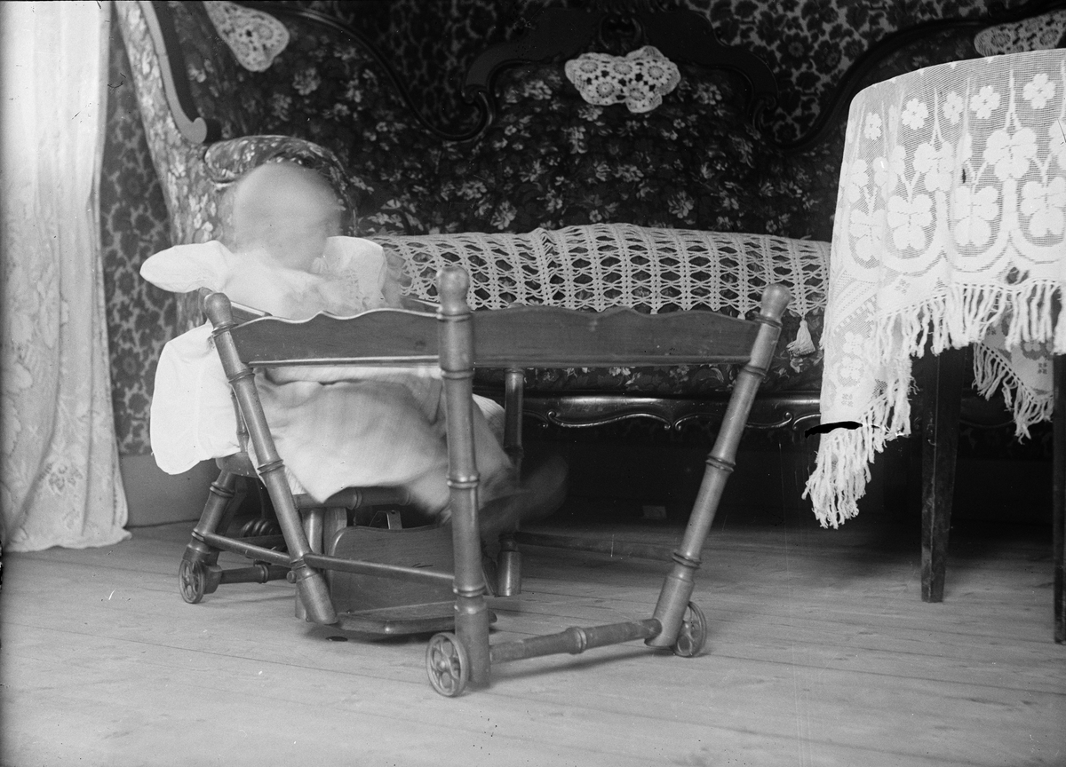 Litet barn sitter i barnstol i hemmet, sannolikt Sverige