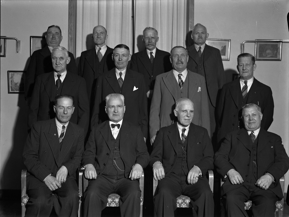 Ordföranden i Svenska Järnvägsmannaförbundet, Axel Löfgren, och ordföranden i uppsalavdelningen, Gustaf Netterdag, flankerar de hyllande järnvägsveteranerna - stationsförman J A Eriksson, stationsförman A V Ask, trafikbiträde A M Tallroth, bangårdsmästare A Lilja, vagnförman K A Eriksson, stationsförman J A Ahlberg, trafikbiträde A V Ljunggren, banvakt J A Gelin och trafikbiträde Oscar Steen - i festsalen på Östgöta nation, Trädgårdsgatan 15