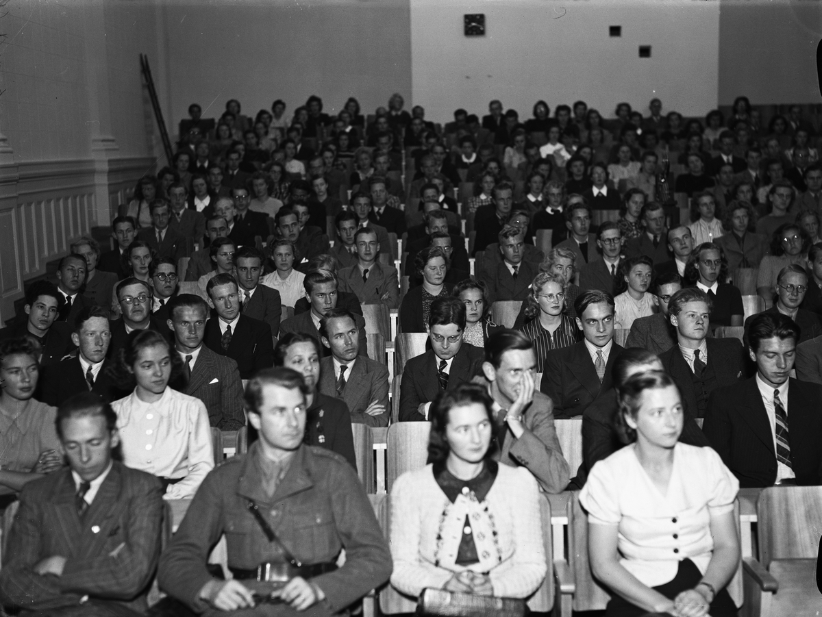 Nyinskrivna studenter lyssnar på Uppsala Studentkårs "råd och anvisningar", sal X, Universitetshuset