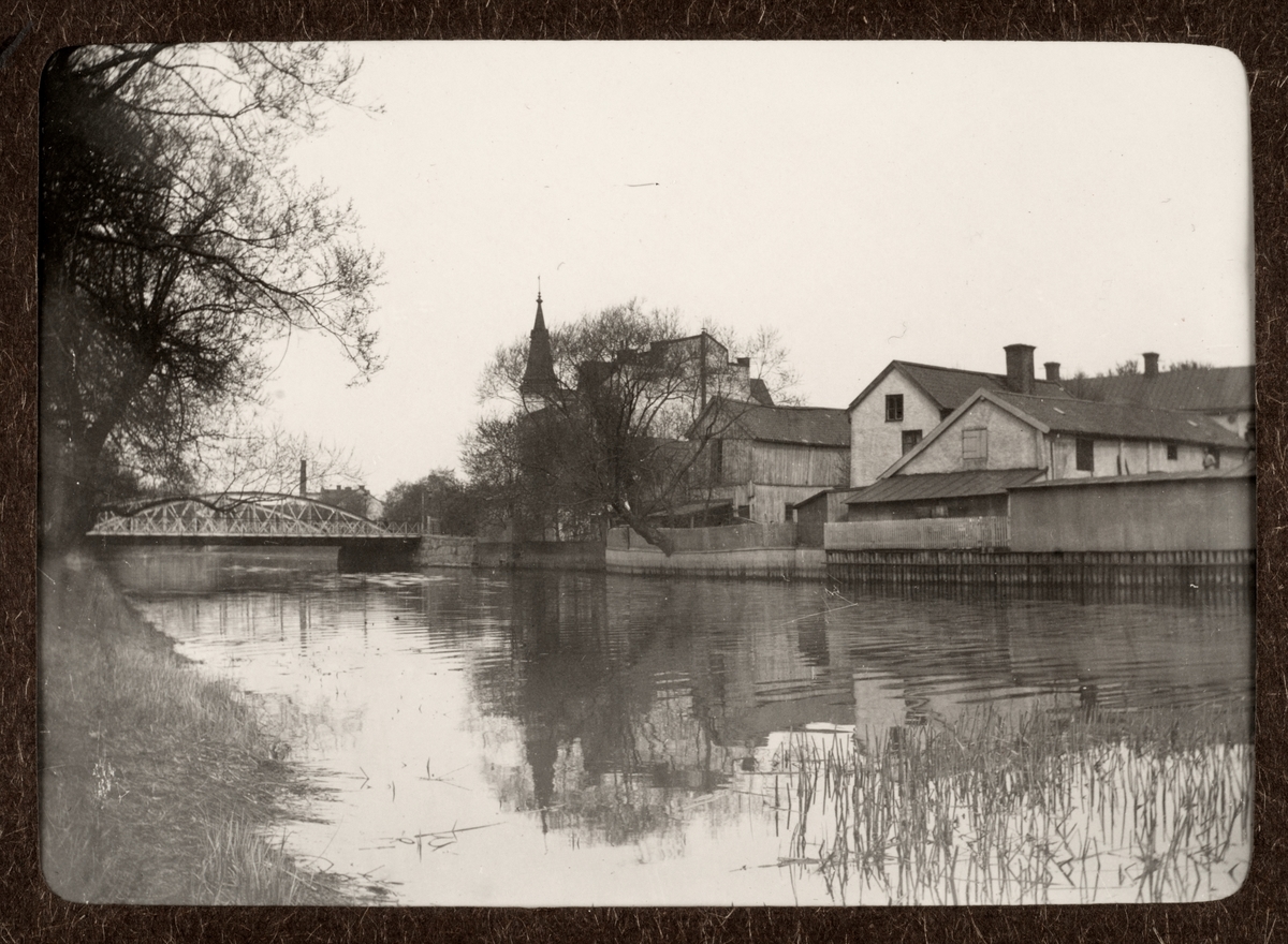 Vy över Fyrisån, Haglunds bro och garverigårdarna, kvarteret Lindormen