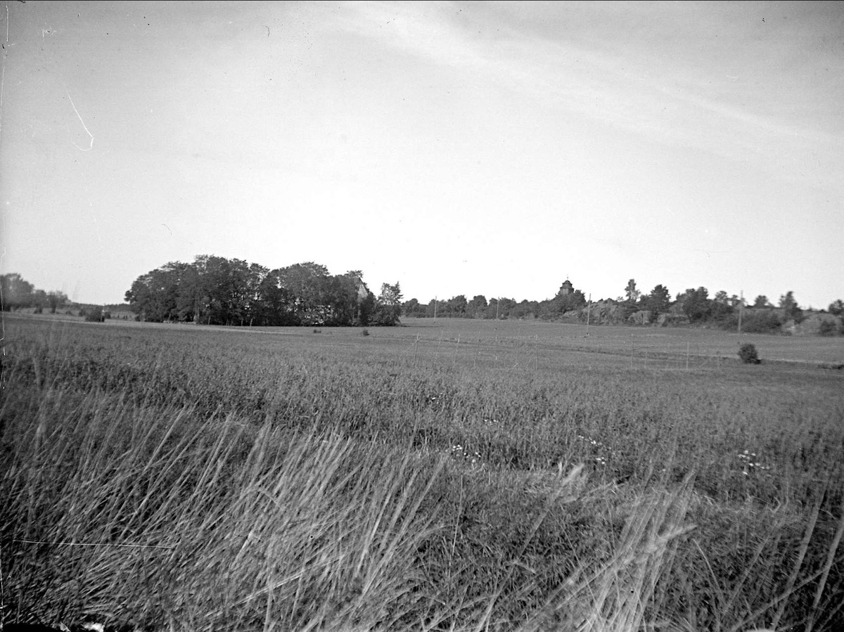 Oldingslandskap i Uppsala-Näs socken, Uppland september 1924. Bakom träden skymtar Uppsala-Näs kyrka.