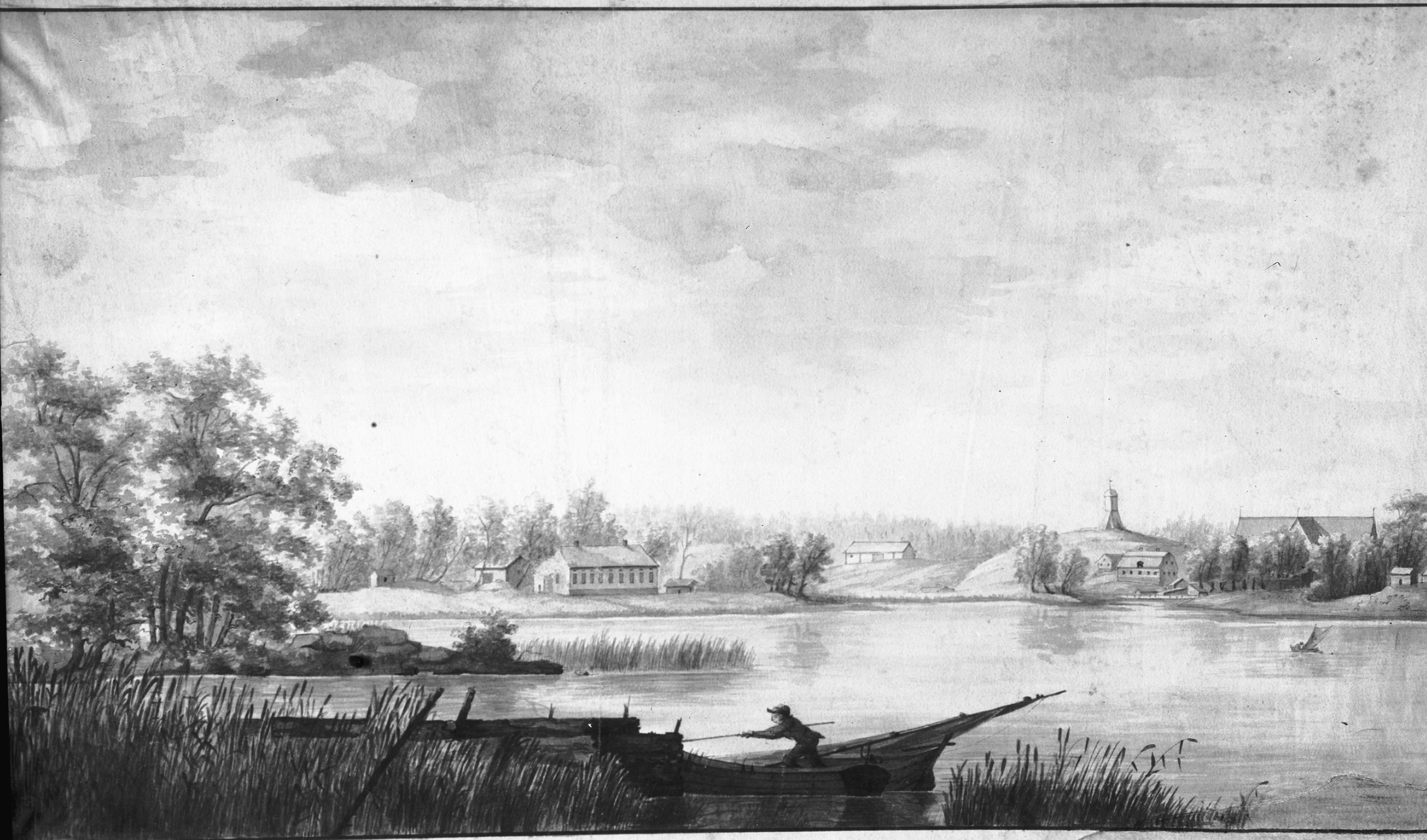Kyrkan och prästgården samt Prästviken. Avfotografering av lavering i sepia, troligen av Elias Sehlstedt, 1850-talet.