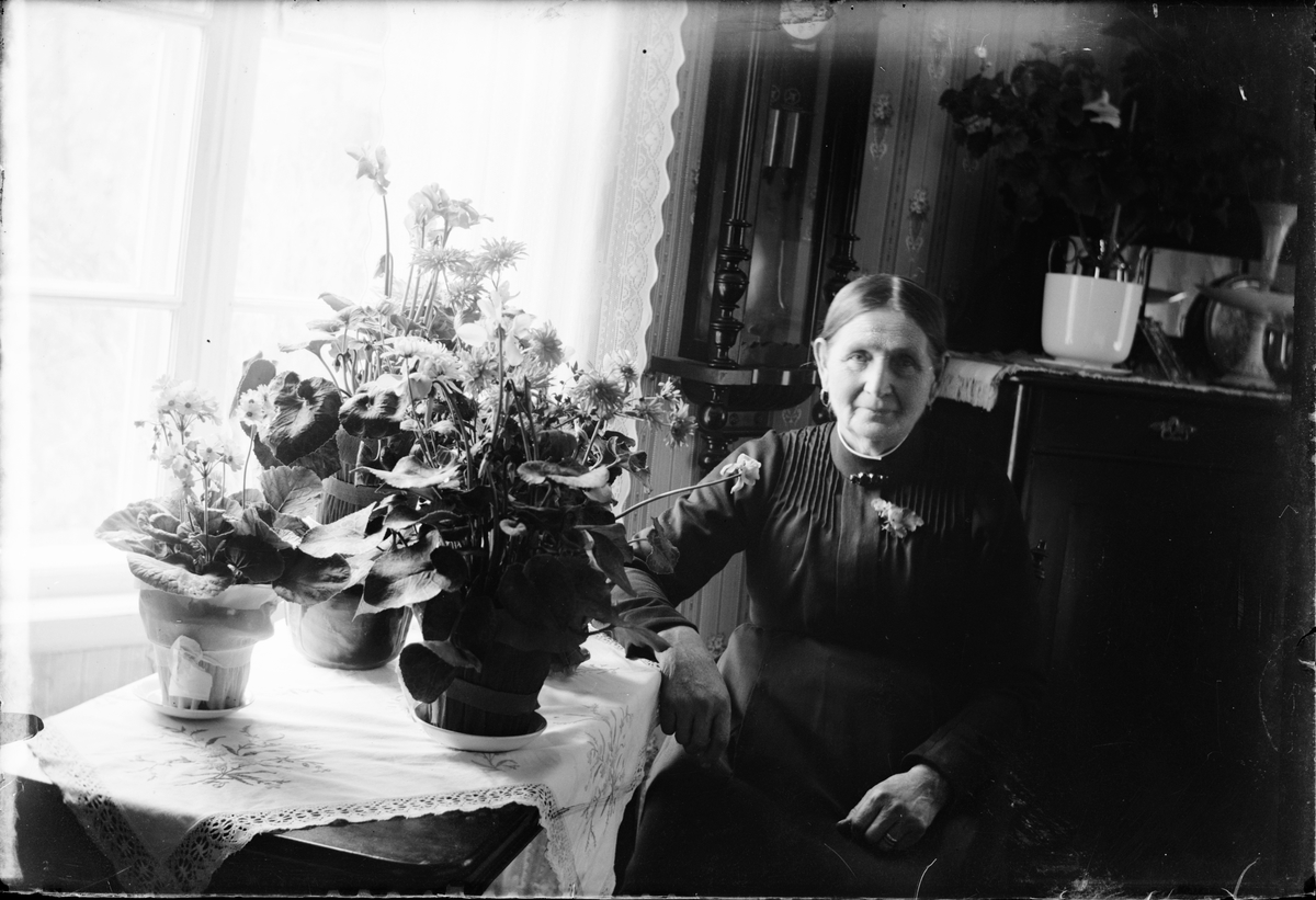 Kvinna sittande vid bord med krukväxter, Östhammar, Uppland