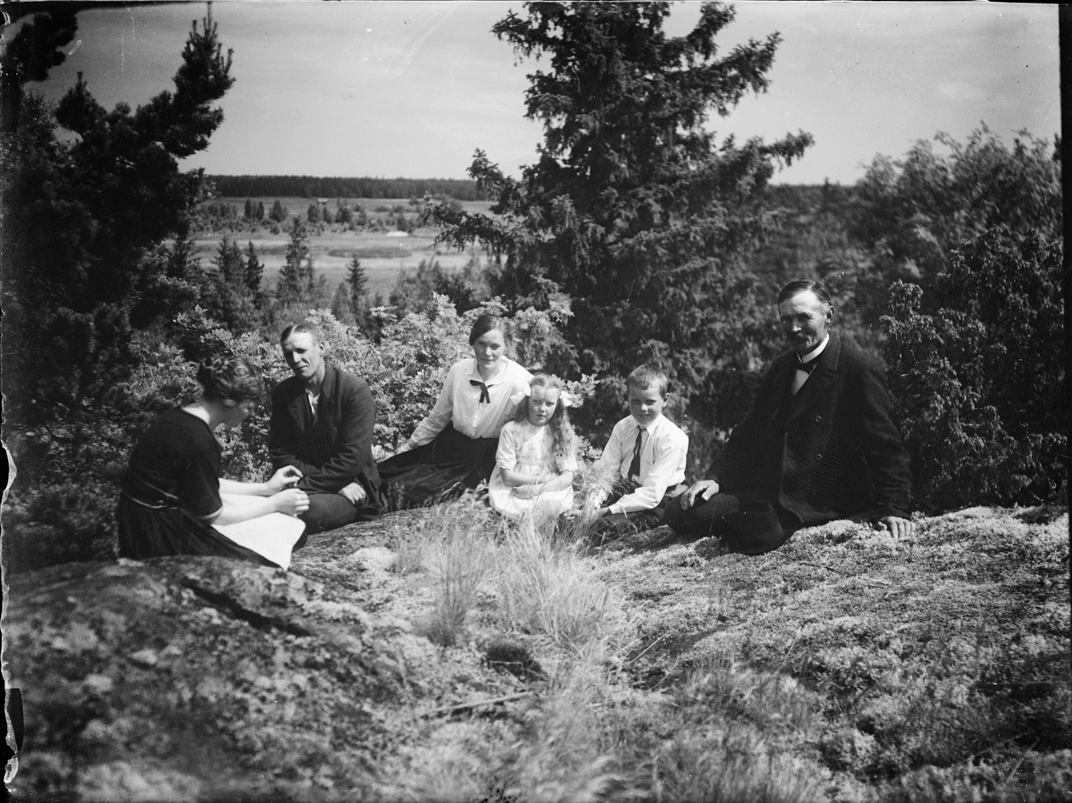 Kvinna, man och barn sitter på en "bergknalle", Östhammar, Uppland