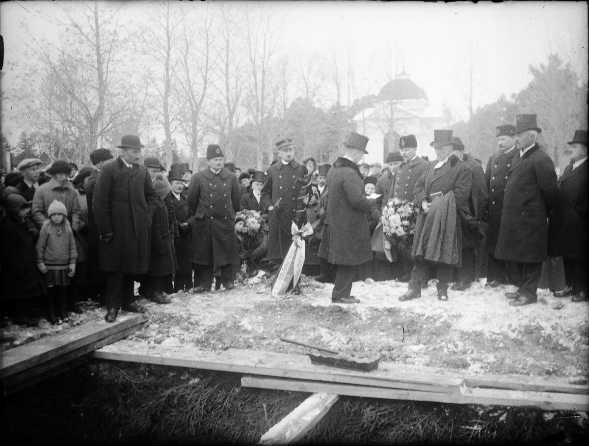 Begravning på Öregrunds kyrkogård. Begravning av sjömän som drunknade då den Holländske ångaren Cornelis gick under utanför Gräsö, Uppland 1922