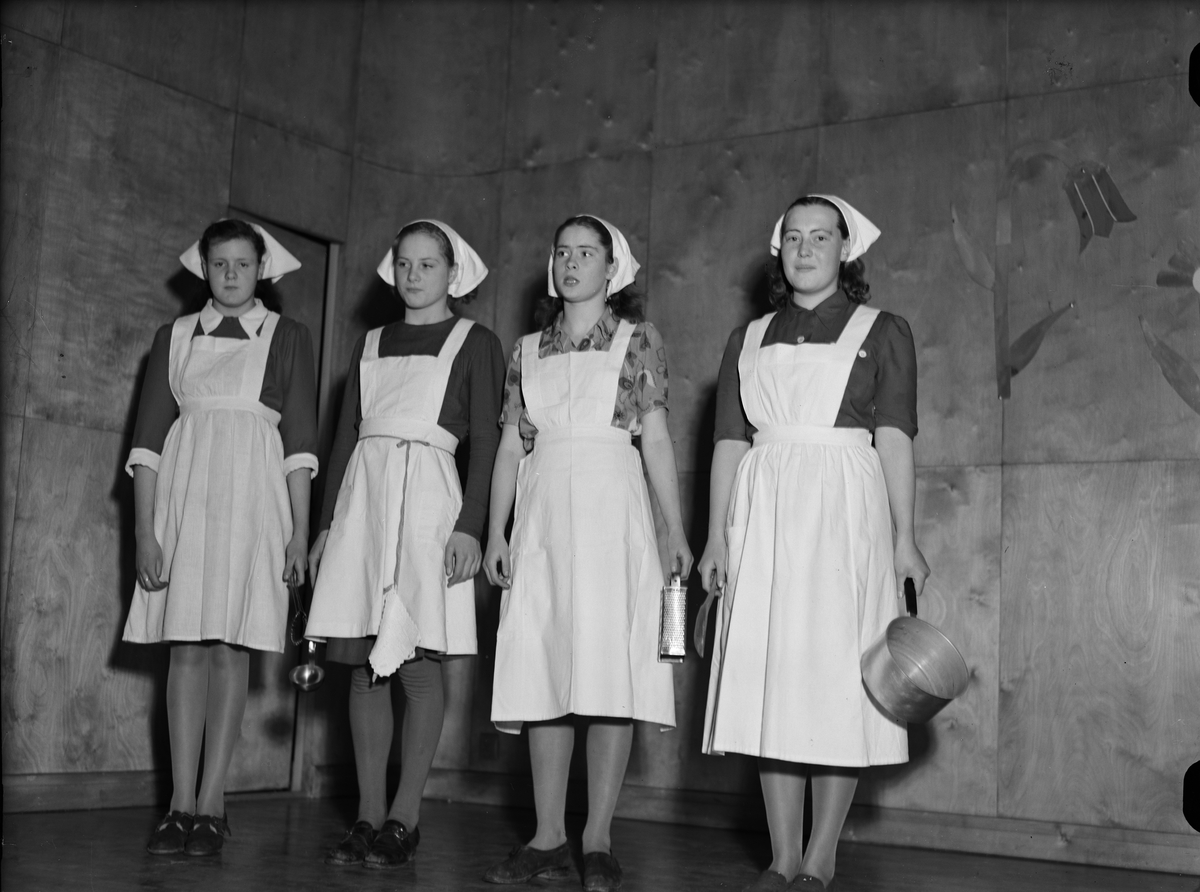 Skolelever i Högre Folkskolan gör en sketch på föräldramöte "som avsåg att illustrera vad Högre folkskolans flickor hittills hade lärt sig i den tvååriga hushållslinjen"