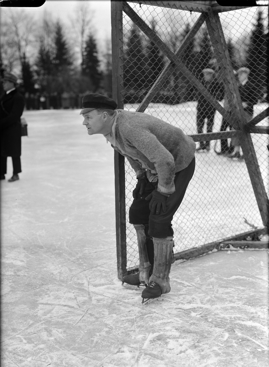 Målvakten Sven "Sleven" Säfwenberg i bandymatch mot Västerås S K på Studenternas Idrottsplats, Kronåsen