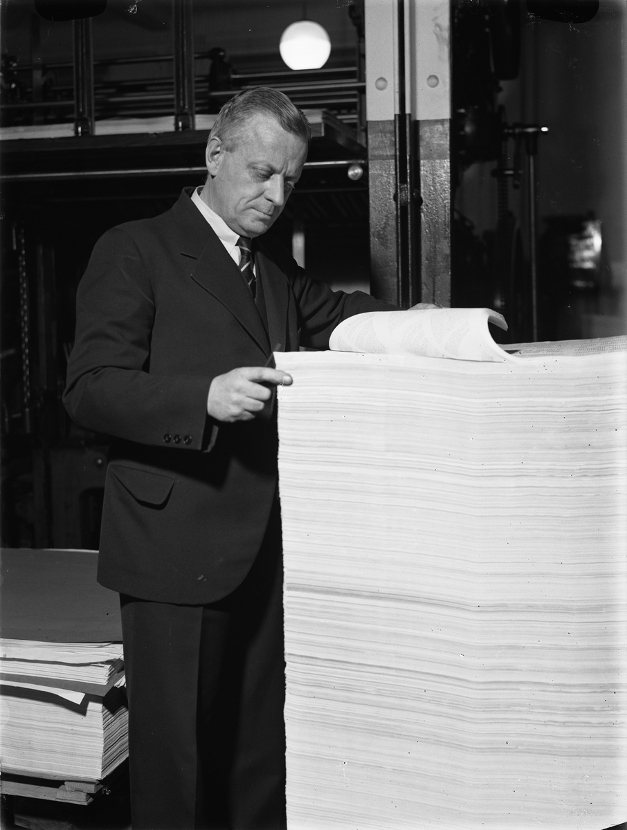 Man vid pappersark, sannolikt på tryckeri, Uppsala 1937