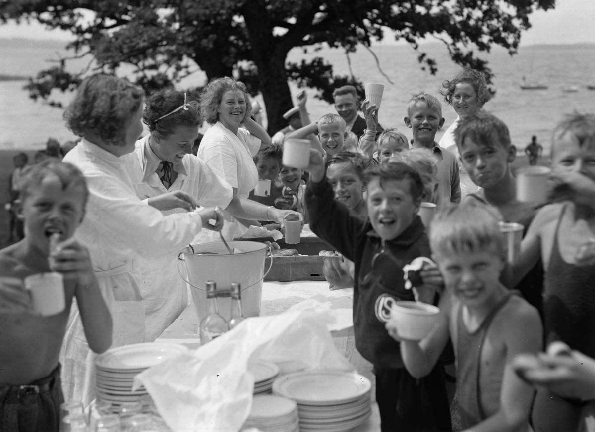 Unga kvinnor delar ut mat till barn på Svenska Motorklubbens uppsalaavdelnings utflykt till Fredrikslunds gård