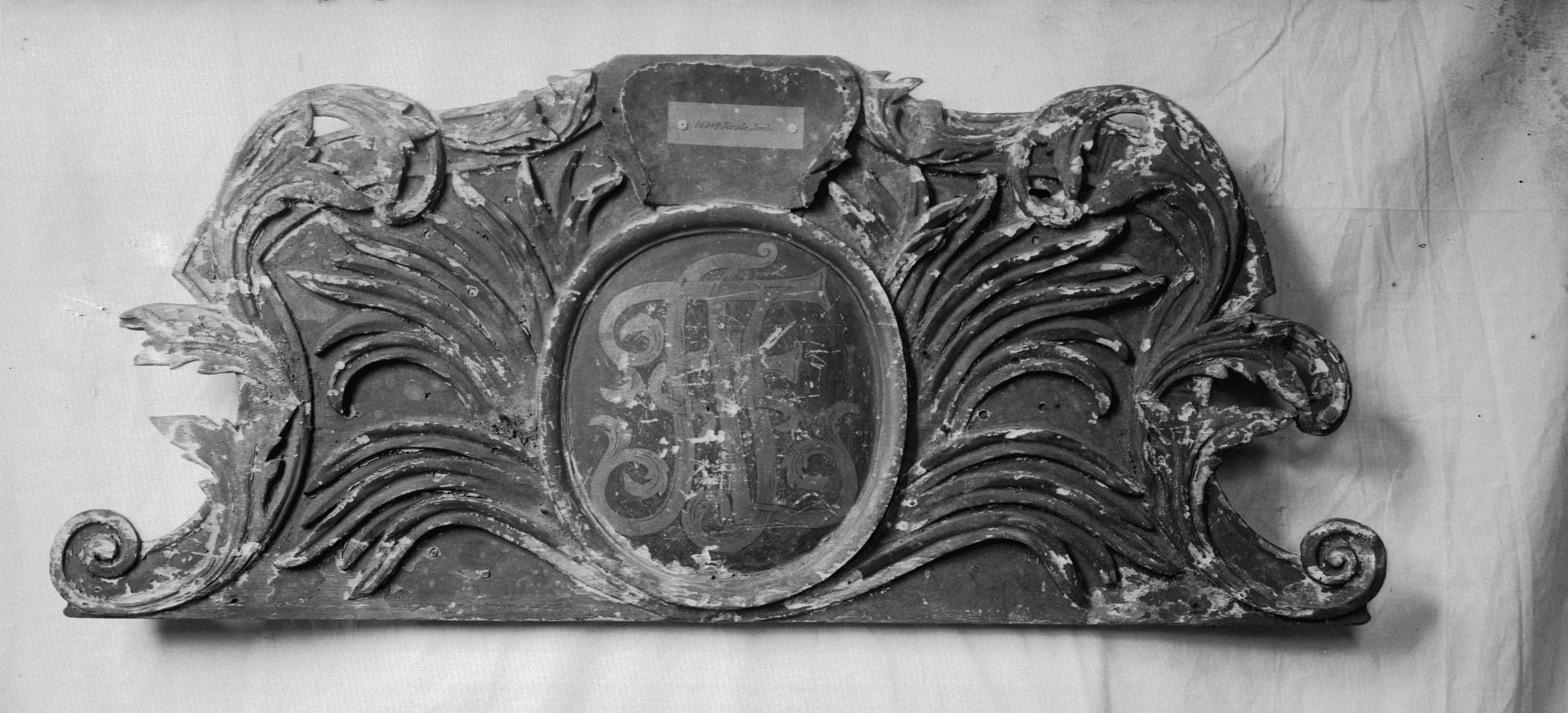 Överstycke av trä med Aldolf Fredriks monogram på.