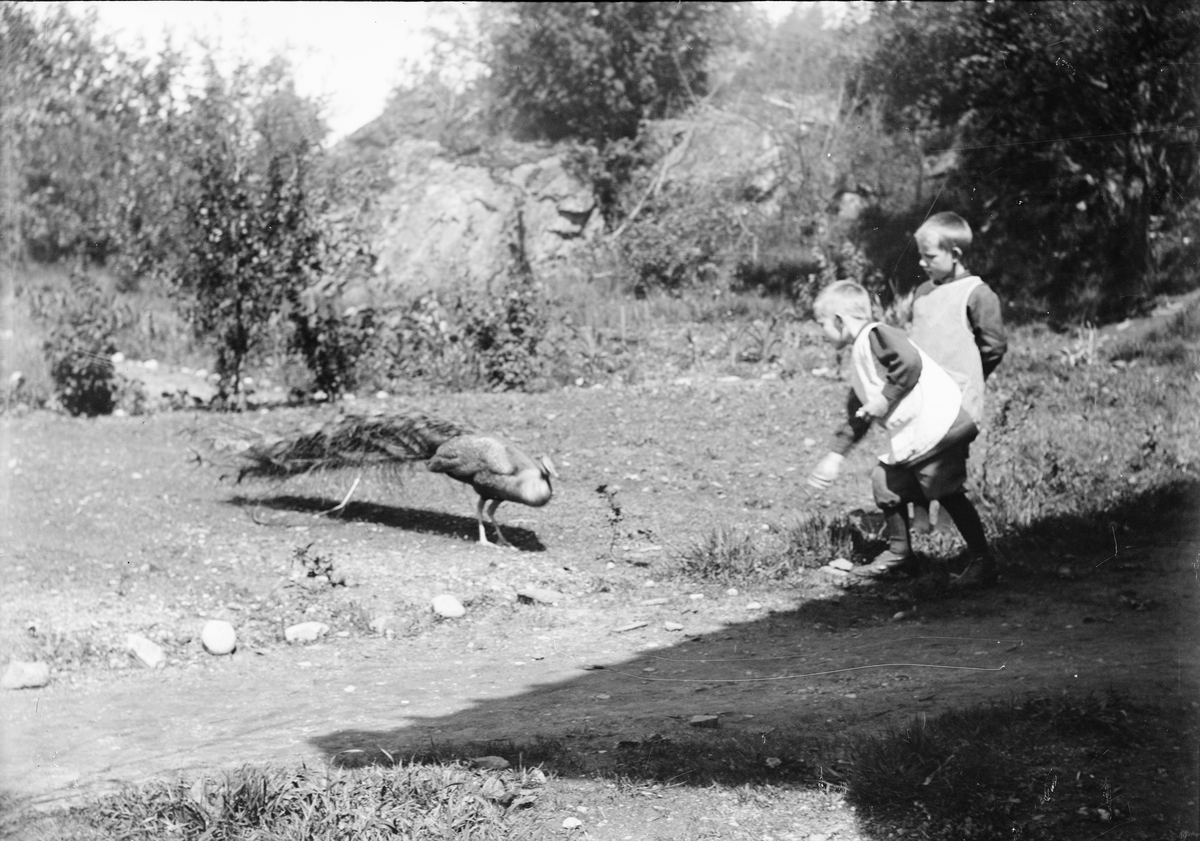Sannolikt två av Ruben och Christiane Liljefors söner matar en påfågel ute på gården, sannolikt i Sverige