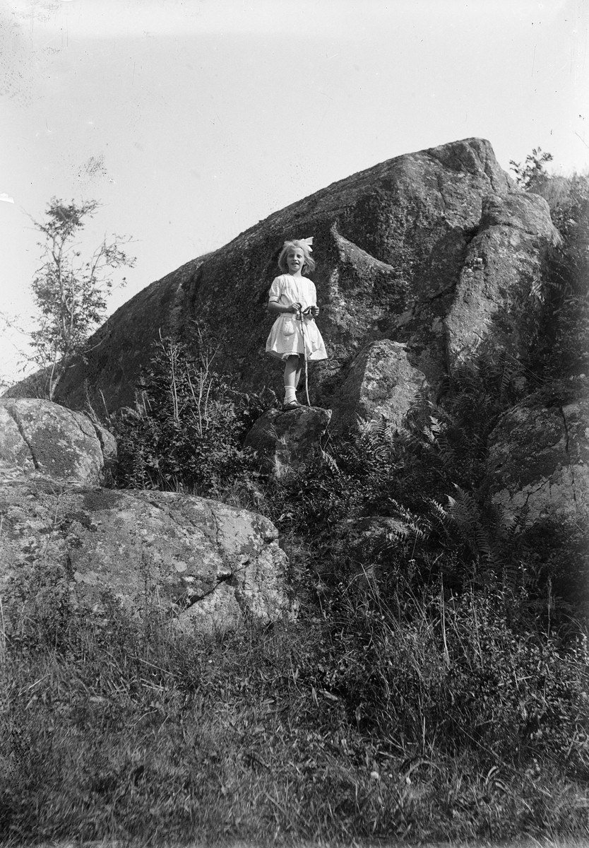 Ruben Liljefors dotter Marit står på sten på berghäll, sannolikt i Sverige