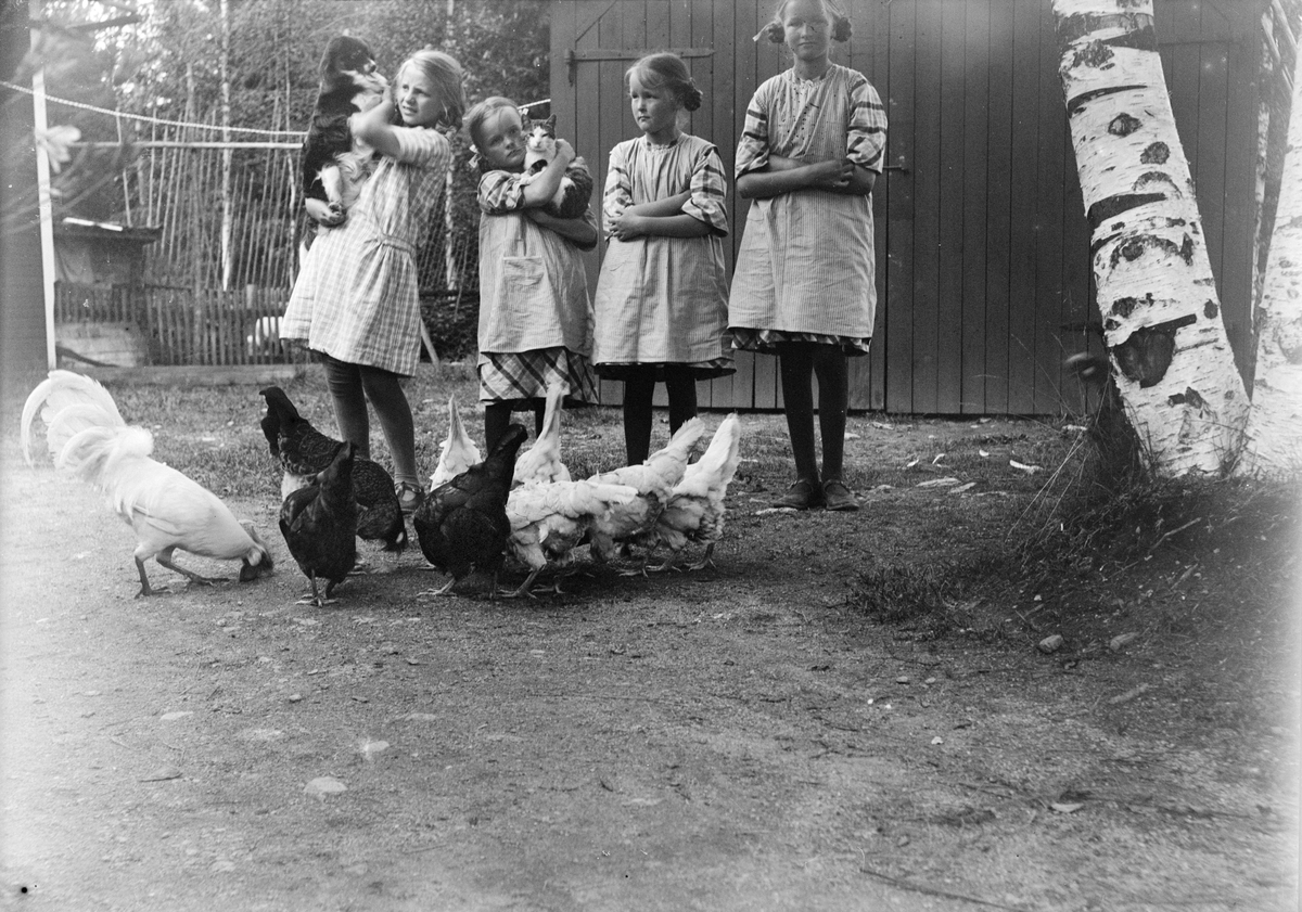 Fyra små flickor, den ena sannolikt Marit Liljefors, med hund och katt tittar på höns ute på gården, sannolikt i Sverige