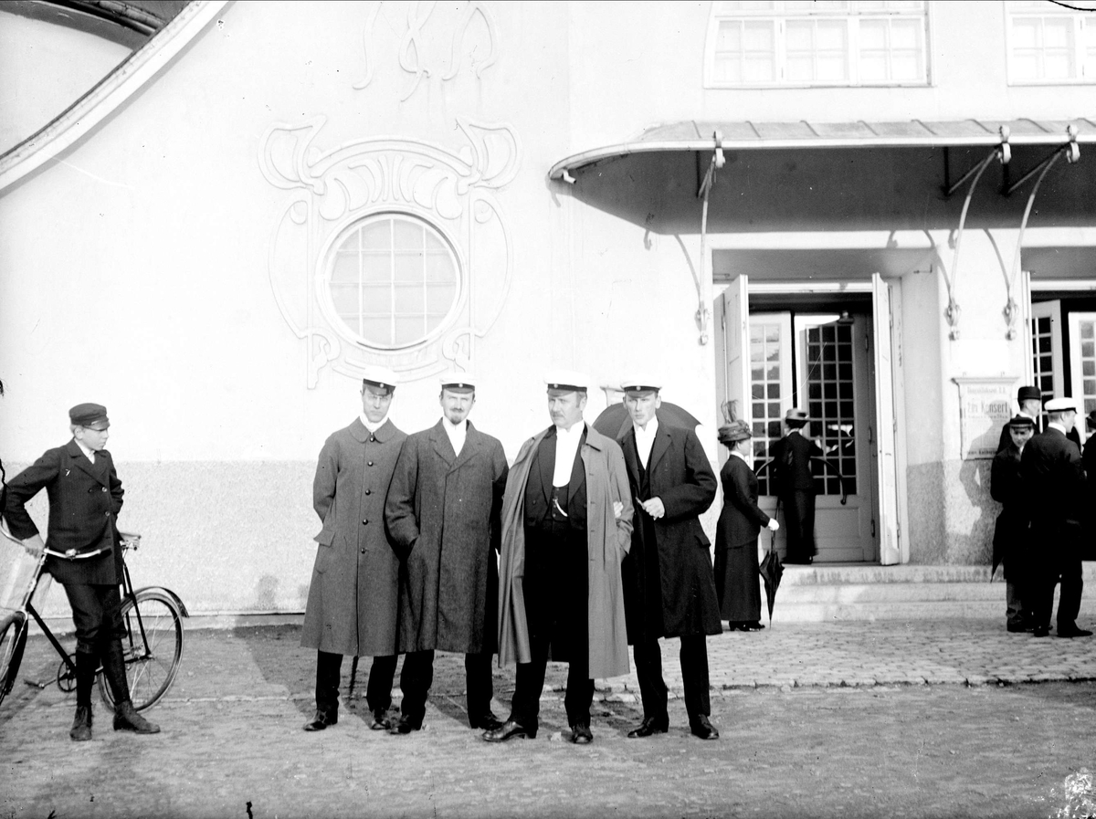 Medlemmar i manskören Orphei Drängar utanför konsertlokal 1913