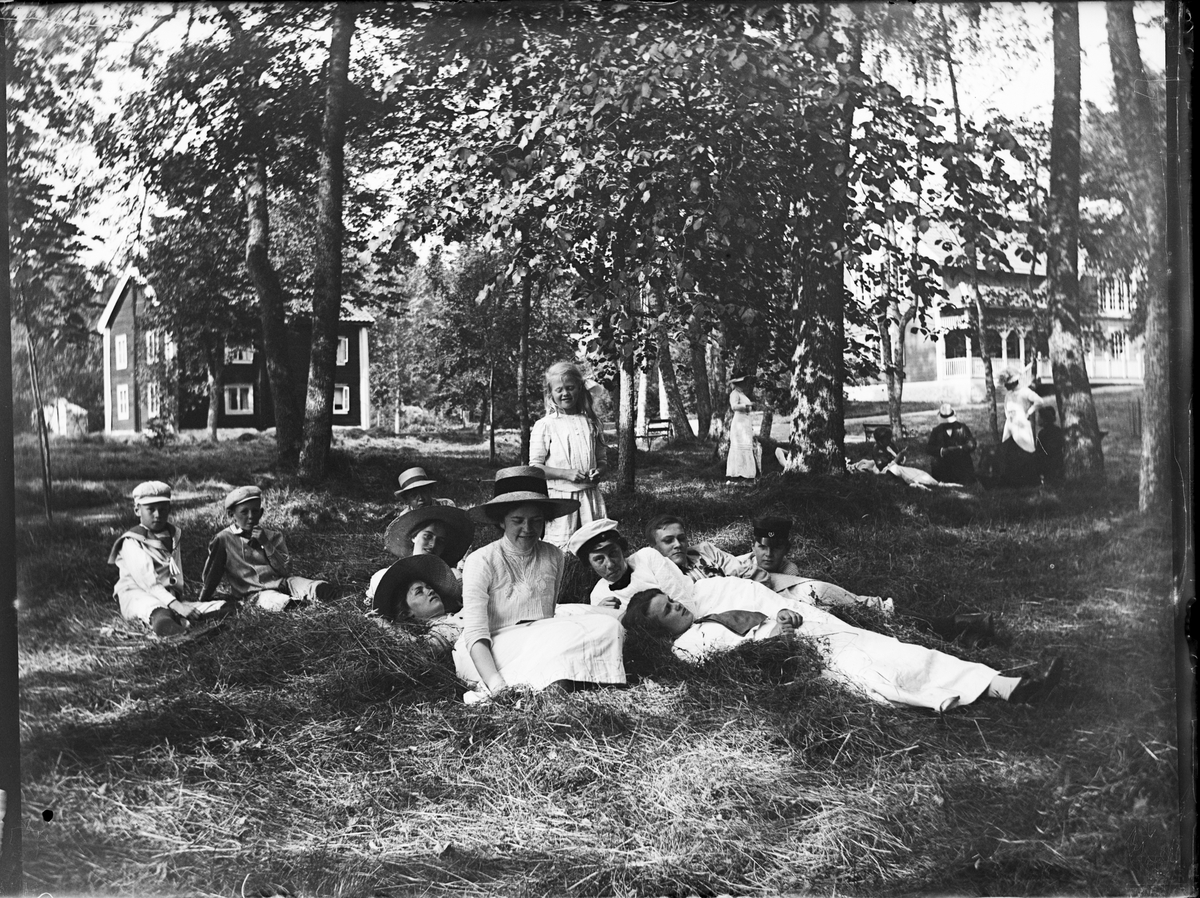 Kvinnor och män ligger i gräset, Sätra brunn, Sala