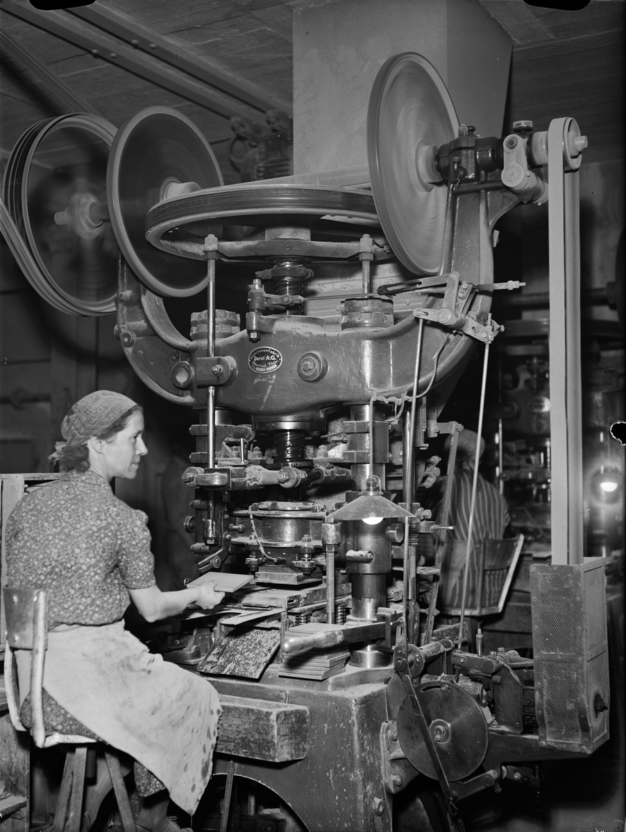 Kvinna vid maskin som bearbetar kakelplattor, Upsala-Ekeby AB, Flogsta