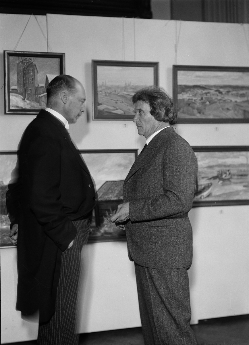 Okänd man och konstnären Carl Eldh på Upplands Konstförenings konstutställning på Östgöta nation, Trädgårdsgatan 15