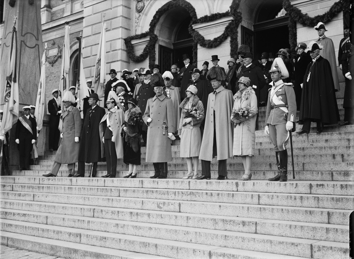 "Jubileumsfästligheterna glansfullt inledda" - kung Gustav V med följe på trappan till Universitetshuset, Uppsala september 1927