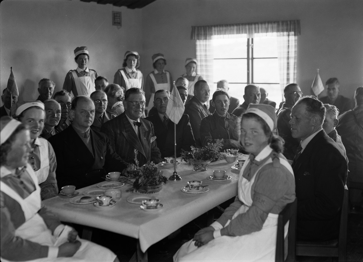 "Lottorna bjudande på invigningskaffe" i skytte- och hemvärnsstugan, längst fram till höger Ingrid Lithammer (född Eriksson) och hennes far Edvin Eriksson, Uppsala