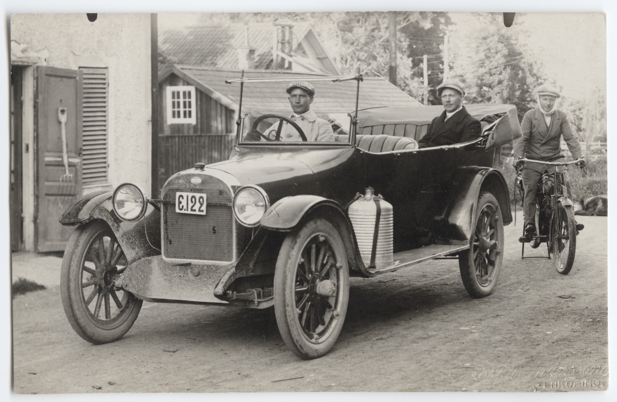 Postkort - AB Eric Lindvalls representant Artur Ax i baksätet på firmabilen, Uppland, omkring 1915