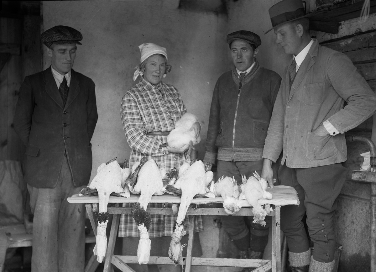 Hemkonsulent Rut Ingeborg Jonsson "och några J. U. F.-pampar med välslaktade fjäderfä på parad" på Danmarks JUF:s kurs i fjäderfäslakt i ett brygghus intill Danmarks hembygdsgård