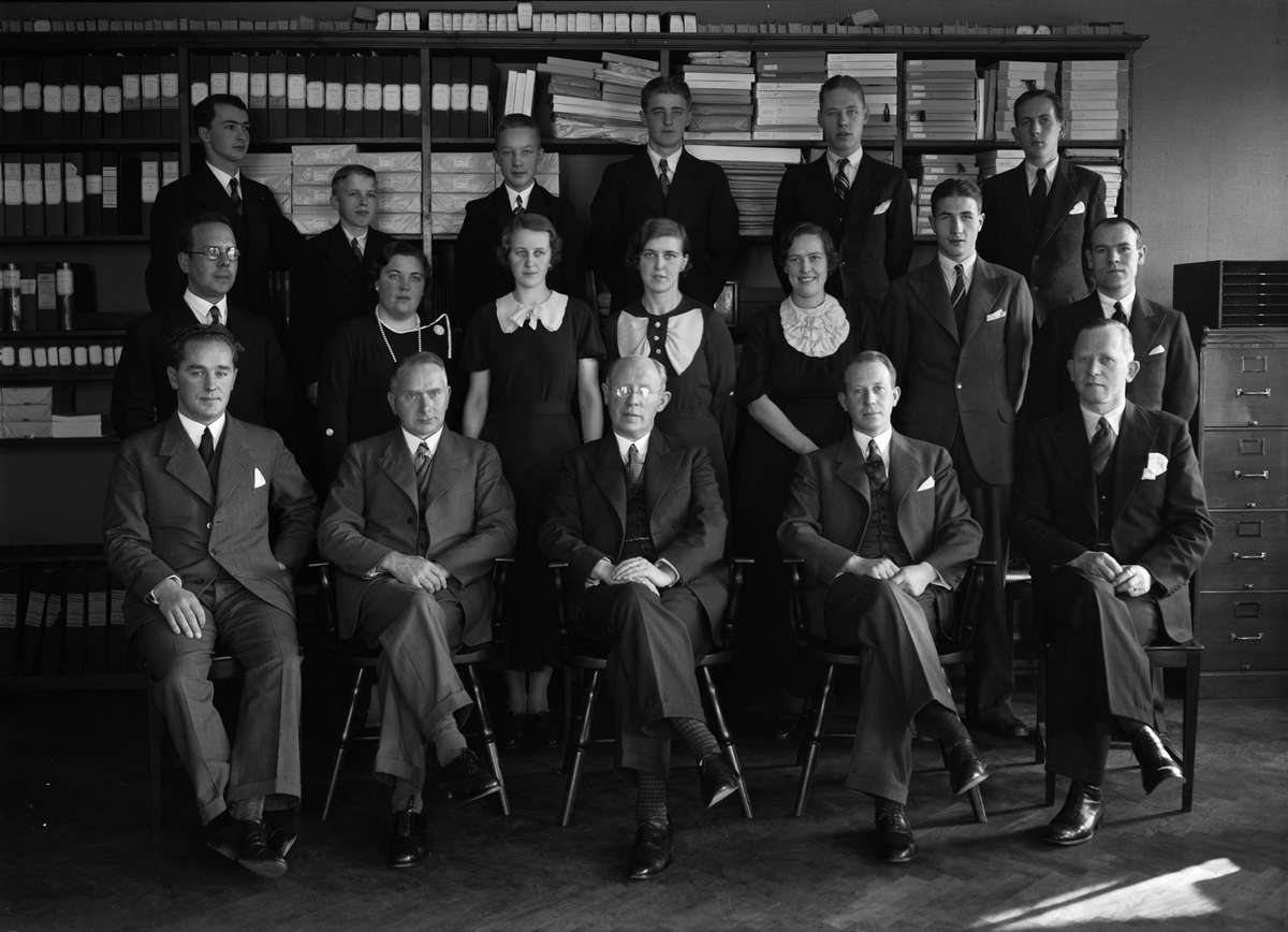 Grupporträtt - personal hos 100-årsjubilerande AB Lundequistska Bokhandeln, Drottninggatan - Östra Ågatan. I mitten av nedre raden verkställande direktören Nils Wallin