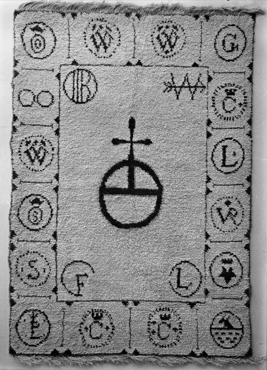 Matta med Uppsala läns vapen i mitten och runt kanterna stämplar från uppländska järnbruk