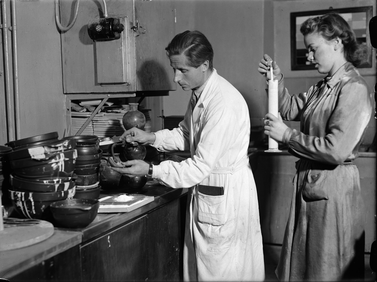 Ingenjören Erik Augustin "biträdd av assistenten fröken Svensson" i laboratorium på Upsala-Ekeby AB, Flogsta