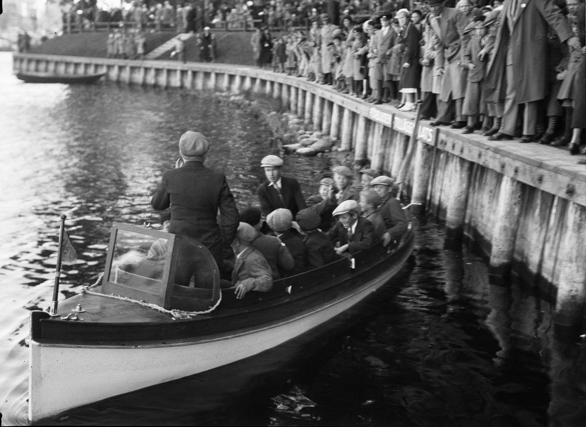 Barn ombord på båt som ska ta dem till "Barnens ö" vid Liljekonvaljeholmen under Barnens Dags-firandet, Fyrisåns strand, Stadsträdgården