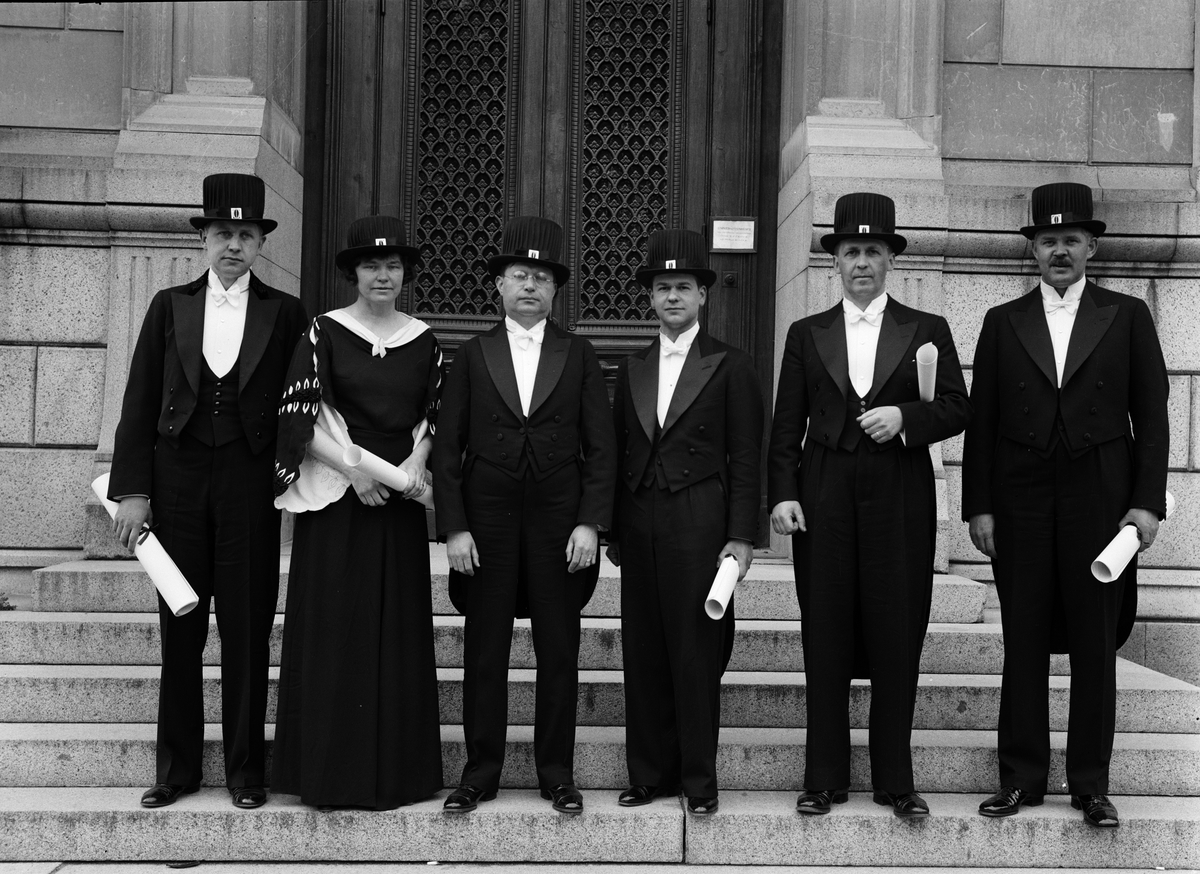Doktorspromotion vid Uppsala universitet - medicine doktorerna med promotor Bernhard Jacobowsky på Universitetshusets trappa