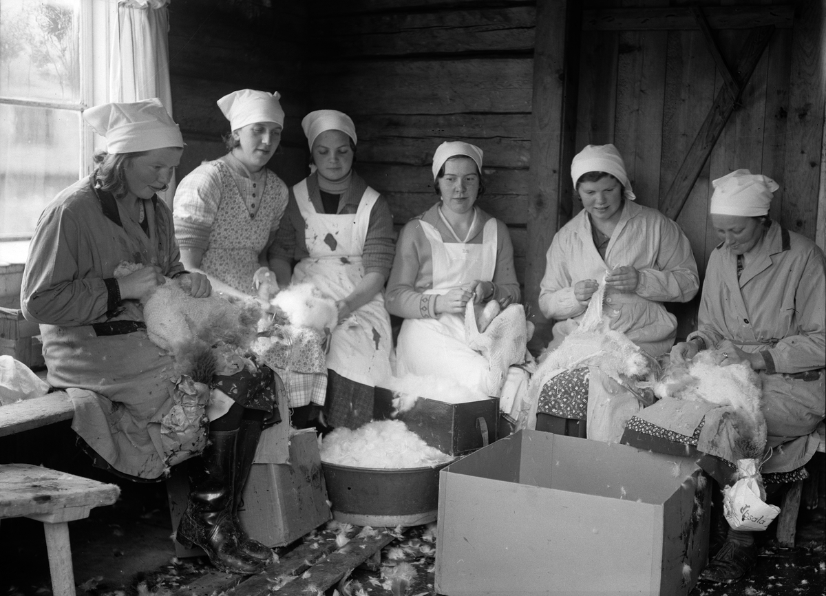 Unga kvinnor plockar dun på Danmarks JUF:s kurs i fjäderfäslakt i ett brygghus intill Danmarks hembygdsgård