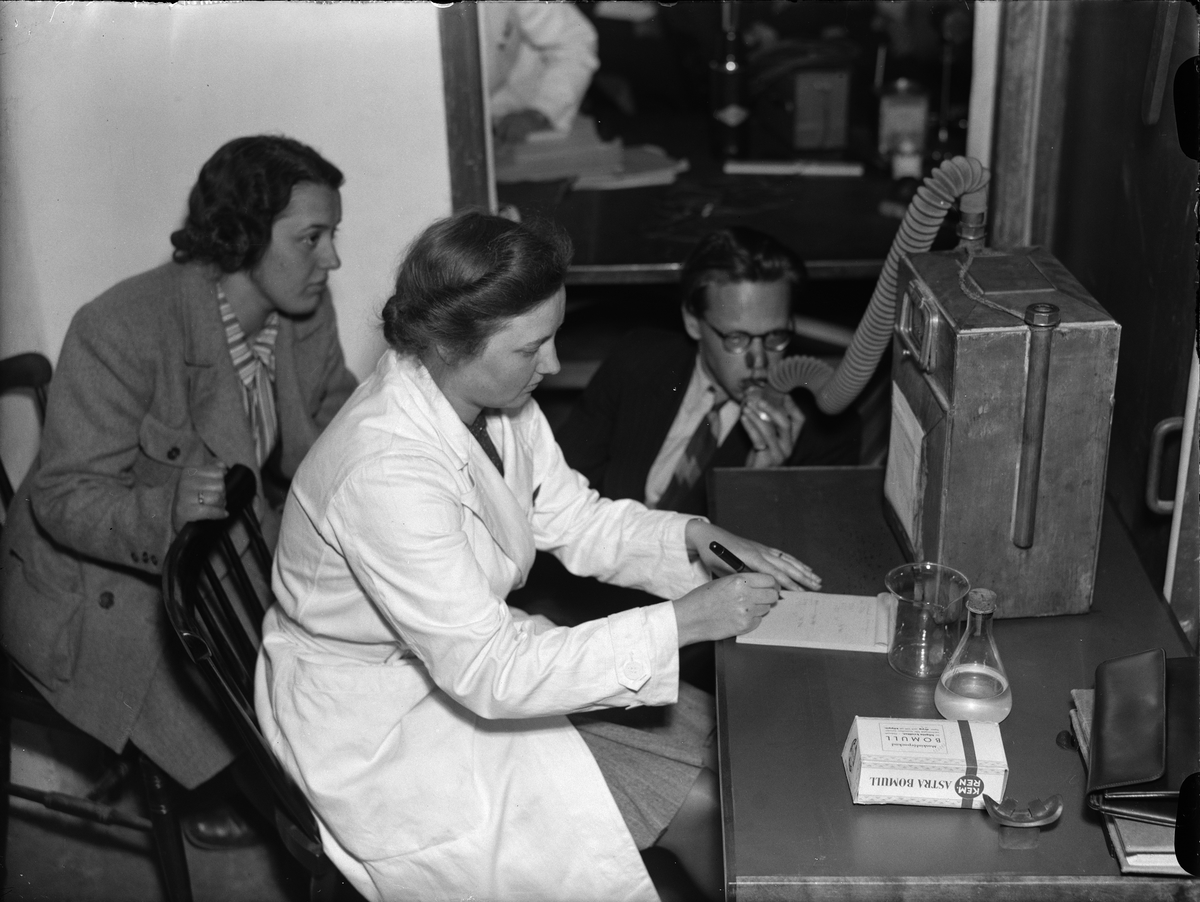 "Skyddsrumsövning gav goda erfarenheter" - Stina Ställberg, assisterad av Kerstin Werkmäster, mäter Sixten Roland-Franzéns andningsvolym, Uppsala april 1942