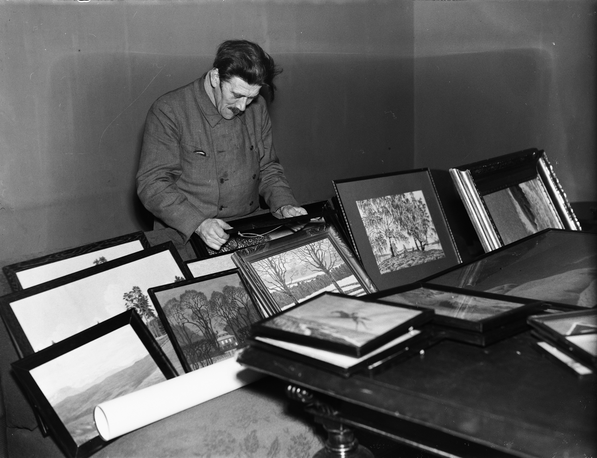 "Thunmanutställningen i vardande" - konstnären Olof Thunman förbereder inför konstutställning på Uplands nation, Uppsala 1942