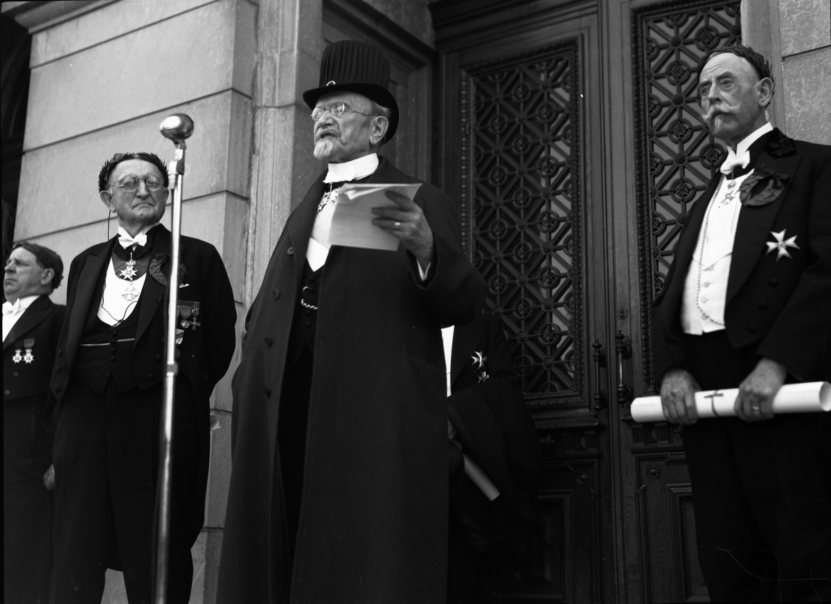 F d landshövding Hjalmar Hammarskjöld tackar å jubeldoktorernas vägnar, Universitetshusets trappa