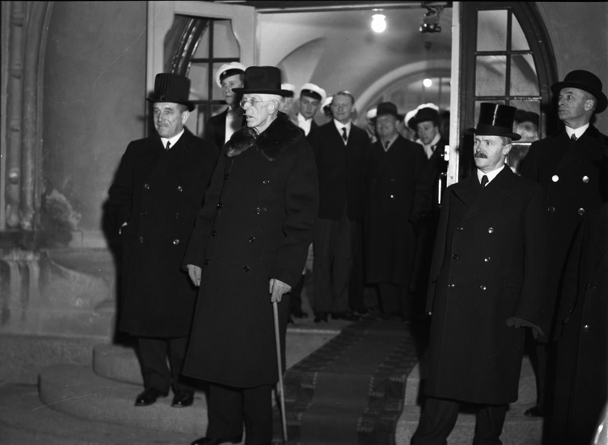 Kung Gustav V på Gymnastikhusets trappa tar emot Uppsala Studentkårs uppvaktning i samband med invigningen av Tennishallen, Sjukhusvägen