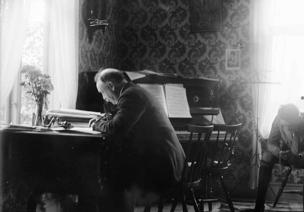 Tonsättaren Ruben Liljefors sitter vid skrivbordet och skriver, en yngre man sitter i bakgrunden, sannolikt hemma hos Liljefors i Sverige