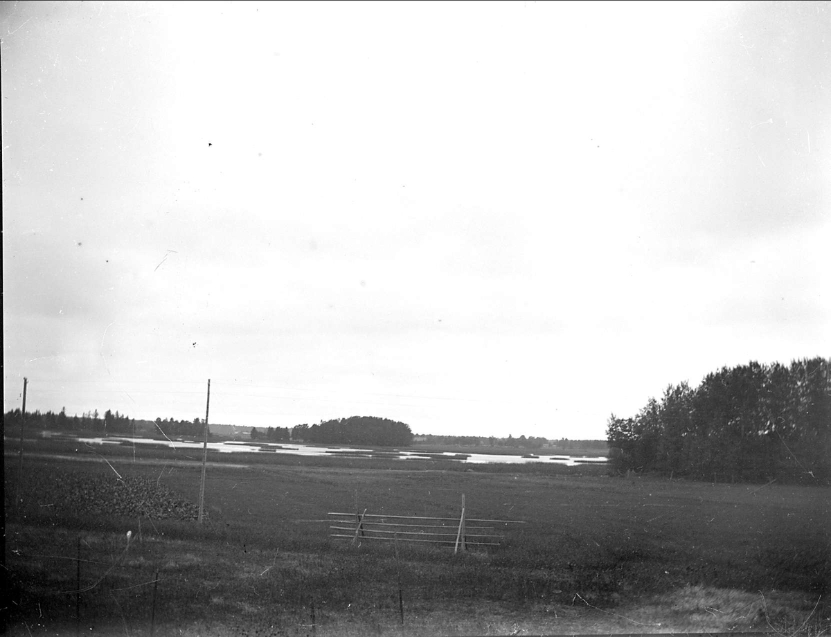 Landskapsvy med ängsmark och sjö i Tegelsmora socken, Uppland, september 1915